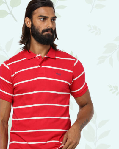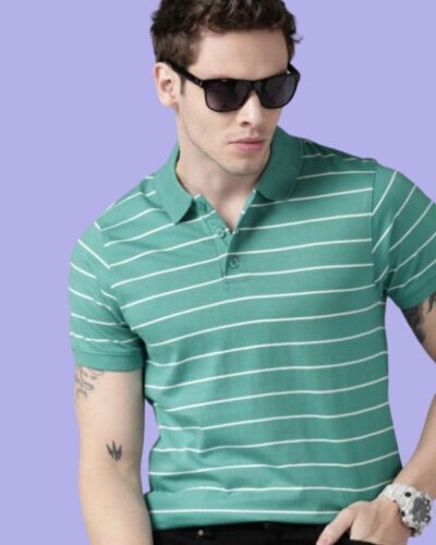 Men Sea Green & White Striped Polo Collar Pure Cotton T-shirt